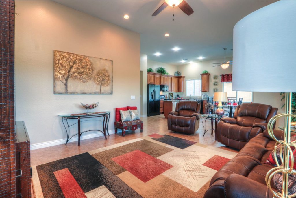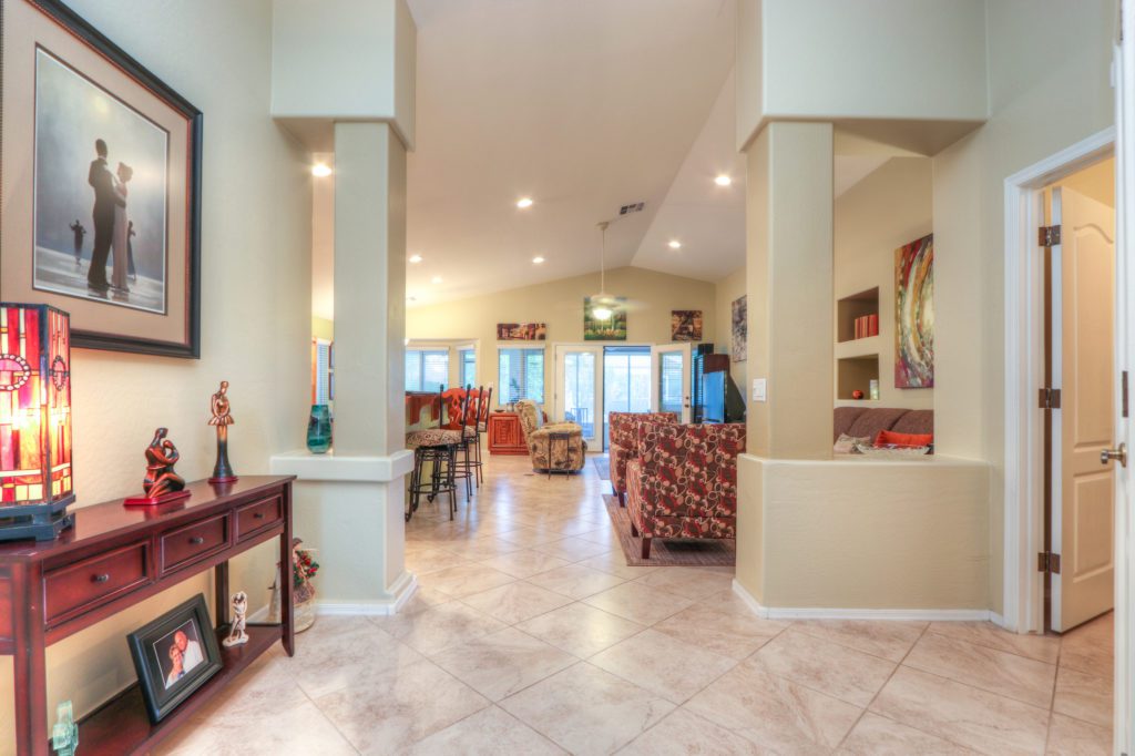 Breathtaking! This turn Key home on the 17th Fairway features 2 bedrooms, 2.5 baths, den, 20” tile & carpet flooring, recessed lighting, ceiling fans, engineered stone counter tops, RO, water softener, 42” cabinets with crown molding & pull outs, in suite bedroom and bathroom for your guests, master w/his & her closets, raised bathroom vanities, dual sinks, extended length garage w/epoxy flooring & built in cabinets. Outside features include South facing courtyard at entry, security door, extended back patio with some of the best mountain & golf course views in Mission Royale. Please call today to schedule your private showing!