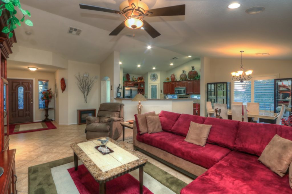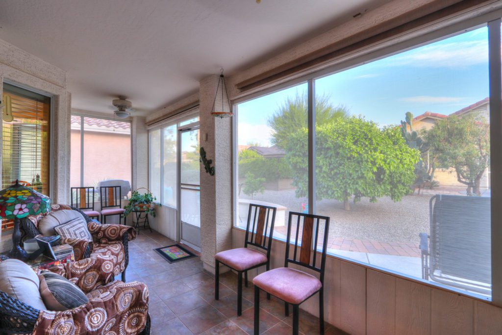 Lovely 104 model in the popular Mission Royale Active Adult Golf Course Community. This well cared for home features 2 bedrooms, 2 bathrooms, security door, fresh interior paint, vaulted ceilings,18” diagonal tile, recessed lighting, granite counter-tops, bay windows in dining & guest room, plantation shutters in master bedroom, raised vanities w/dual sinks in master bath, walk in shower & closet, water softener, laundry room w/ cabinets, 4′ extended garage w/workbench & cabinets, AZ room w/pull down shades, tiled floor & ceiling fan, South facing extended patio, fruit trees, and so much more. Please call today to schedule your private showing!