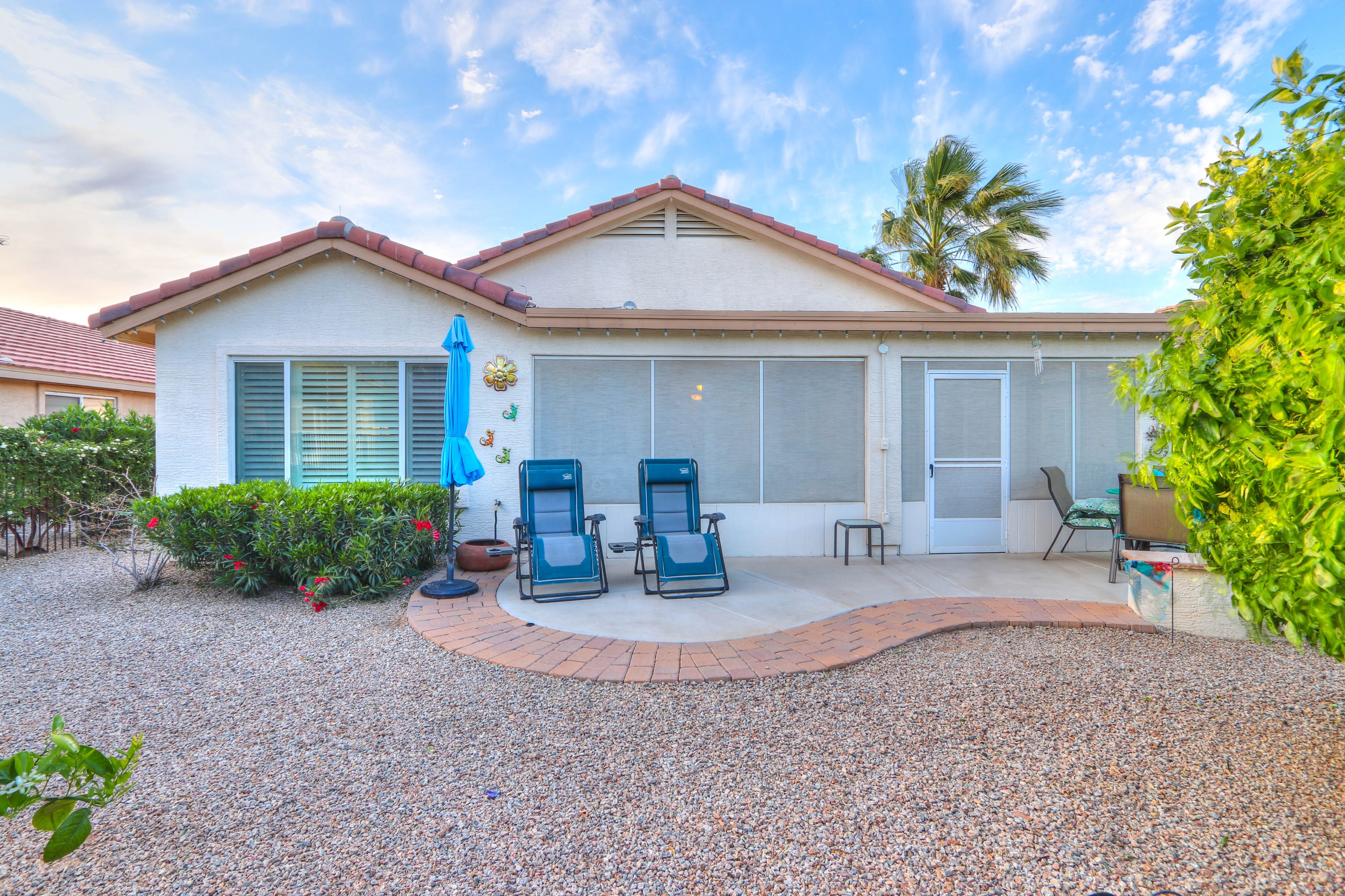 Lovely 104 model in the popular Mission Royale Active Adult Golf Course Community. This well cared for home features 2 bedrooms, 2 bathrooms, security door, fresh interior paint, vaulted ceilings,18” diagonal tile, recessed lighting, granite counter-tops, bay windows in dining & guest room, plantation shutters in master bedroom, raised vanities w/dual sinks in master bath, walk in shower & closet, water softener, laundry room w/ cabinets, 4′ extended garage w/workbench & cabinets, AZ room w/pull down shades, tiled floor & ceiling fan, South facing extended patio, fruit trees, and so much more. Please call today to schedule your private showing!