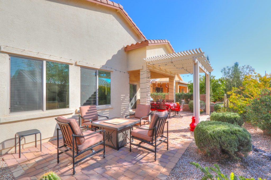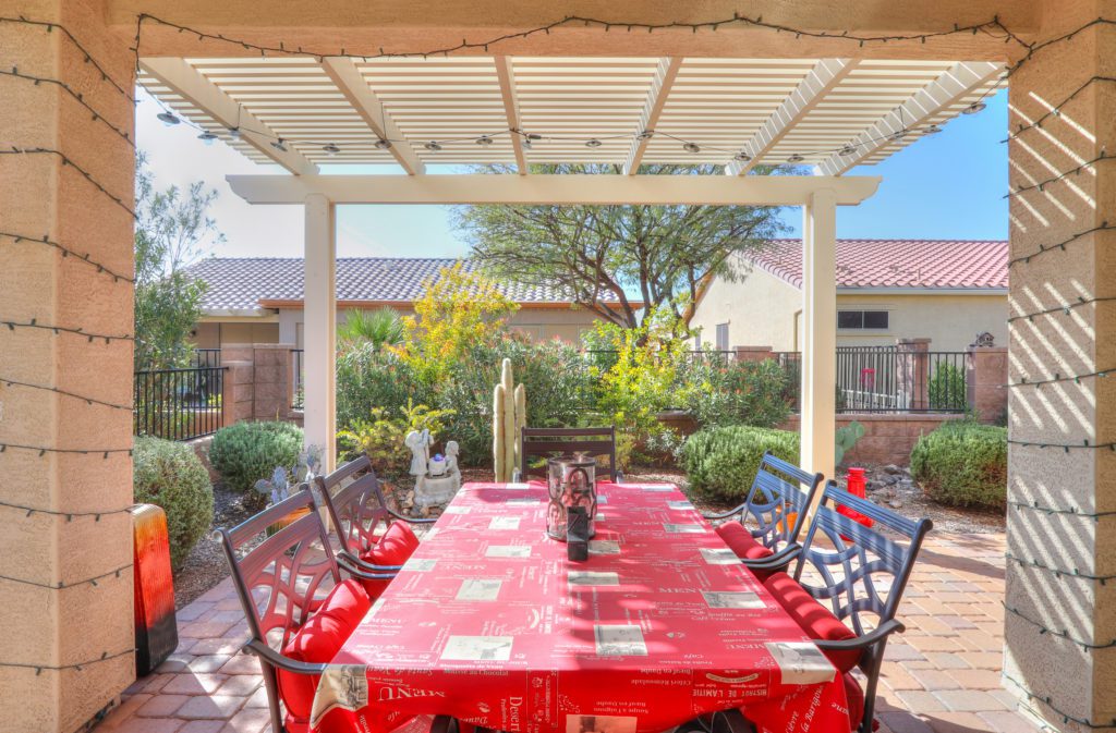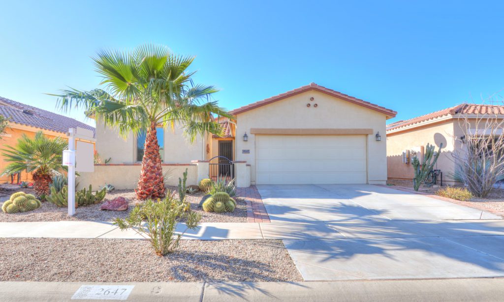 This Energy Efficient home has everything you’ve dreamed of and more! Casa Del Sol 1745 sq ft Model home w/ 2 bedrooms 2 bathrooms and a den w/storage closet. Just some of the latest Energy saving features included are spray foam insulation, full solar with 150 gallon water heater, and low E windows. Inside you will see custom touches throughout, a great room floor plan w/ upgraded kitchen, staggered cabinetry, granite countertops, tiled back-splash, spacious master suite with his & her walk in closets, raised bathroom vanity with dual sinks & drawers, extended garage w/water softener & utility sink. Out back enjoy the South facing extended back patio that features Pergola, ceiling fan, pavers, block & wrought iron fencing, & lush landscaping for extra privacy. This is truly a must see!