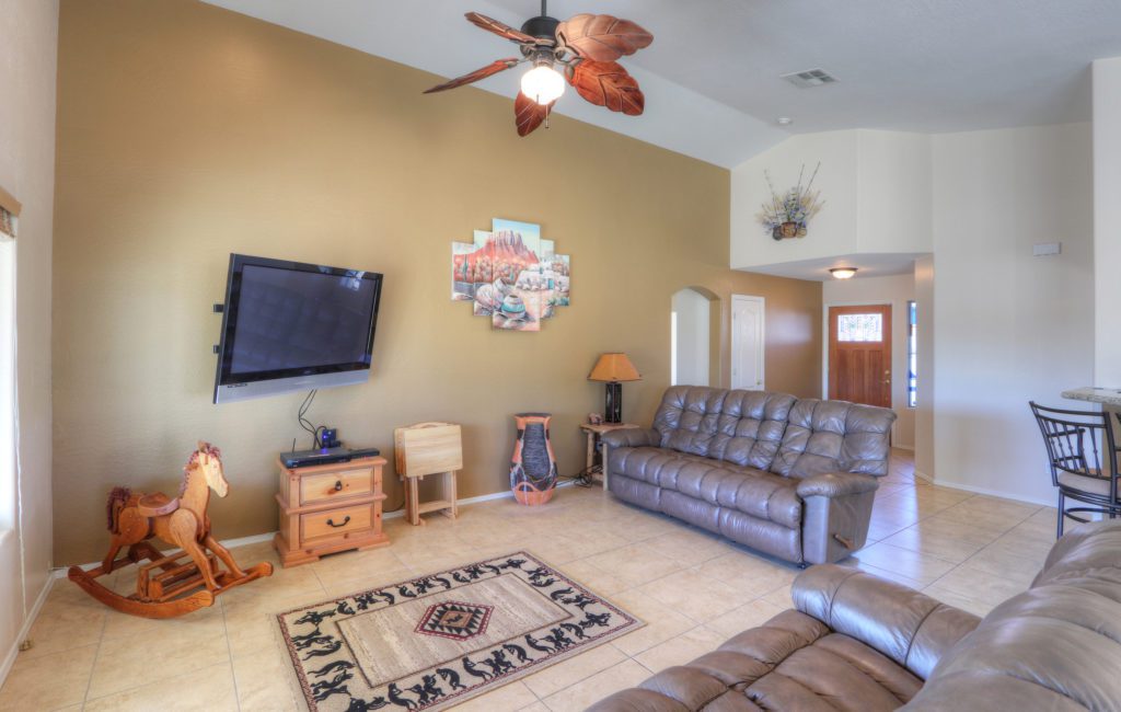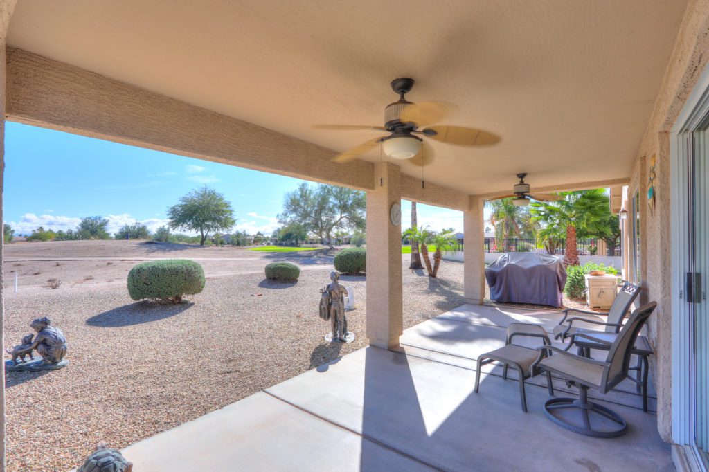 Gorgeous home on premium lot w/amazing Golf Course views! Features include 2 bedrooms, 2 bathrooms, den, over-sized lot next to common area, Flagstone walk around, 20” tile, recessed lighting, faux wood blinds, ceiling fans, granite counter-tops, tiled back-splash, RO, hallway storage closet, built in desk, guestroom w/bay window & large closet, master bath dual sinks, laundry room cabinets, water softener, extended garage w/utility sink & cabinets. Step outside to a covered back patio w/ceiling fans and one of a kind Arizona Sunset & Golf Course views. This home will exceed your expectations, please call today to schedule your private showing!