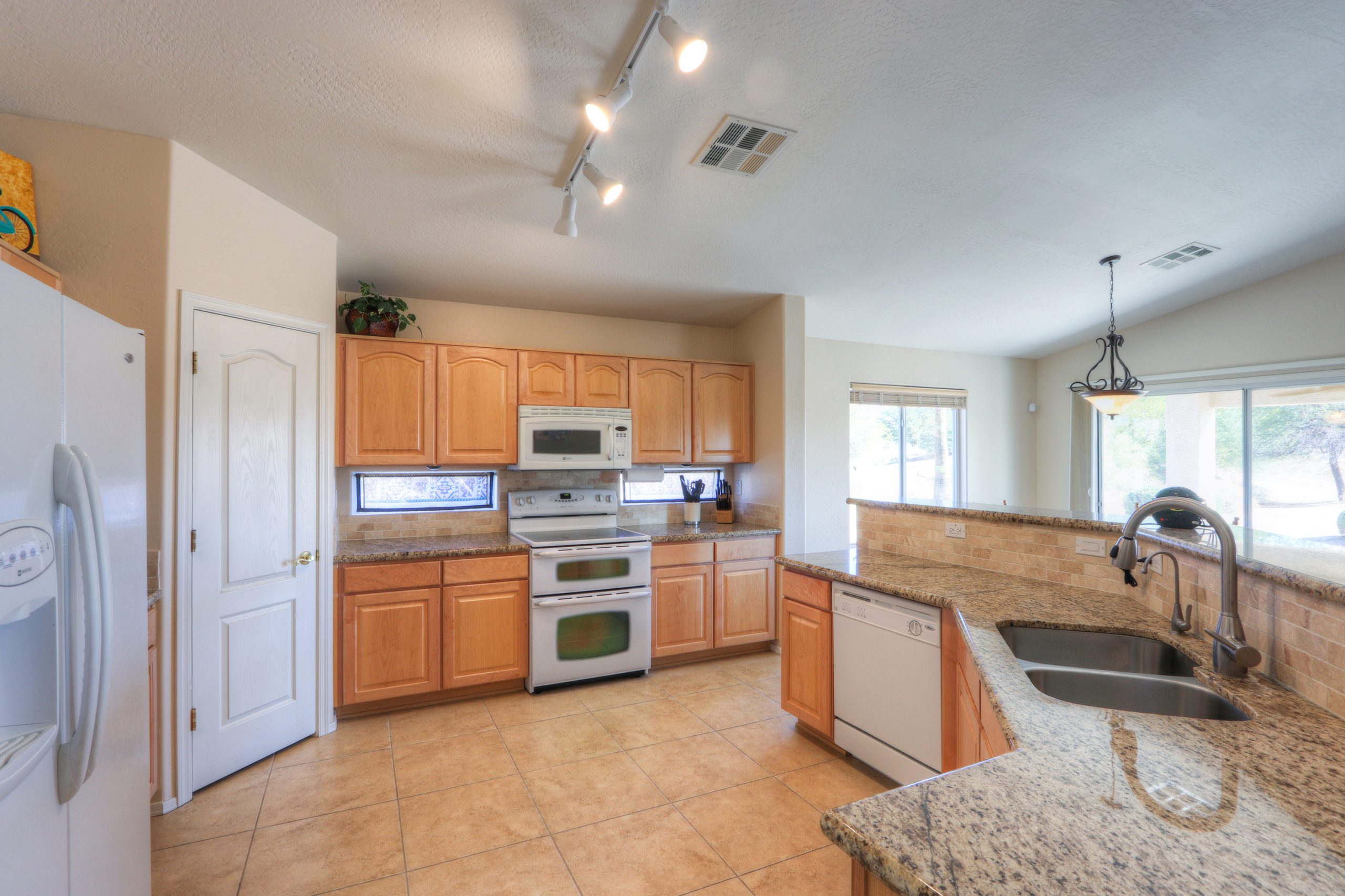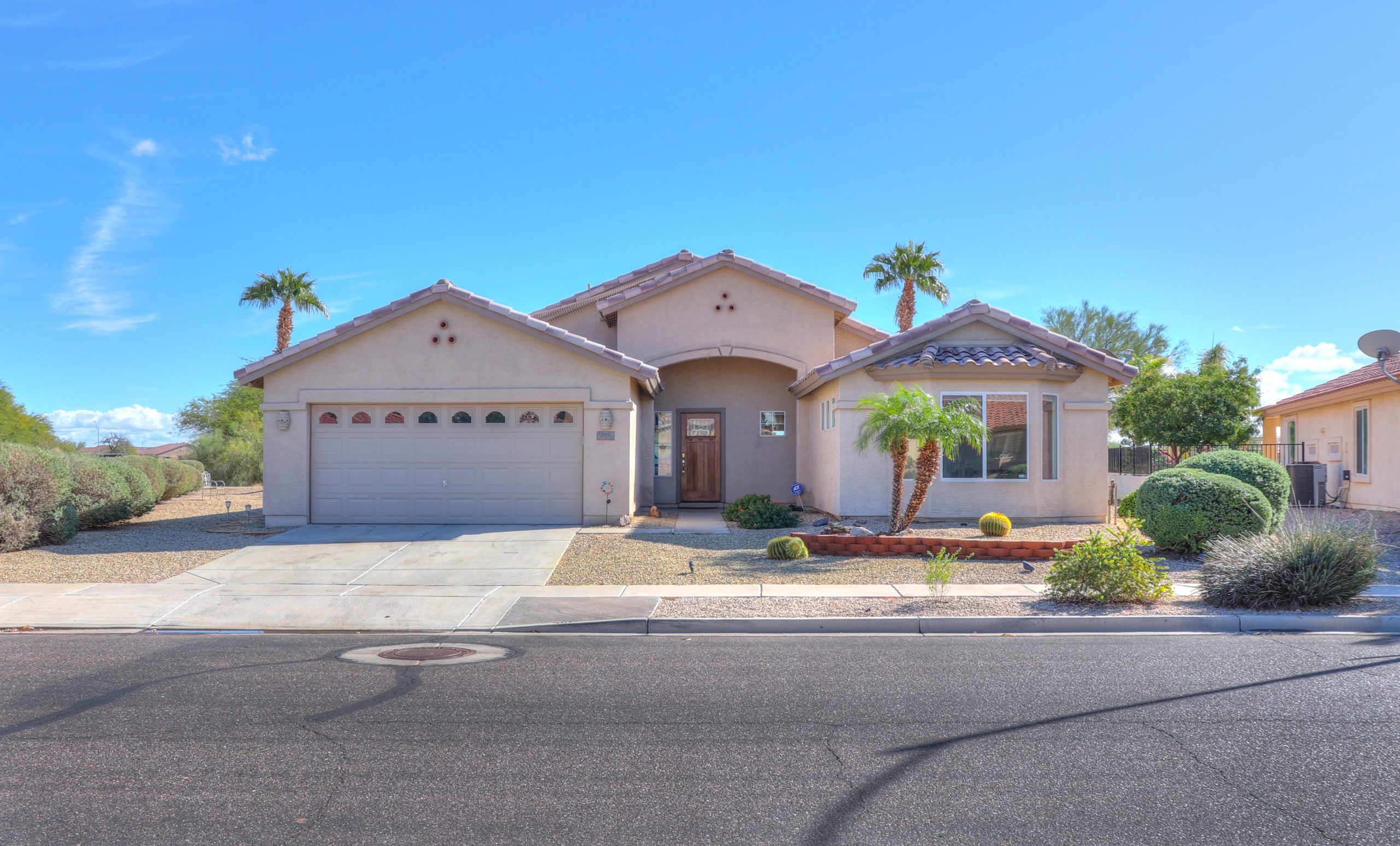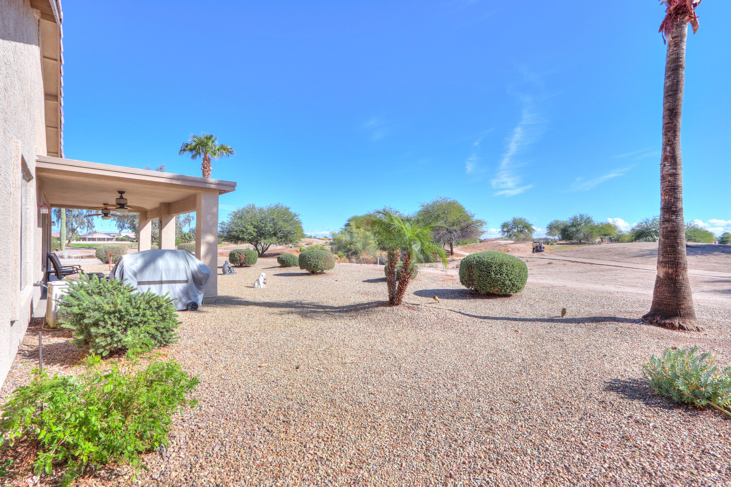 Gorgeous home on premium lot w/amazing Golf Course views! Features include 2 bedrooms, 2 bathrooms, den, over-sized lot next to common area, Flagstone walk around, 20” tile, recessed lighting, faux wood blinds, ceiling fans, granite counter-tops, tiled back-splash, RO, hallway storage closet, built in desk, guestroom w/bay window & large closet, master bath dual sinks, laundry room cabinets, water softener, extended garage w/utility sink & cabinets. Step outside to a covered back patio w/ceiling fans and one of a kind Arizona Sunset & Golf Course views. This home will exceed your expectations, please call today to schedule your private showing!