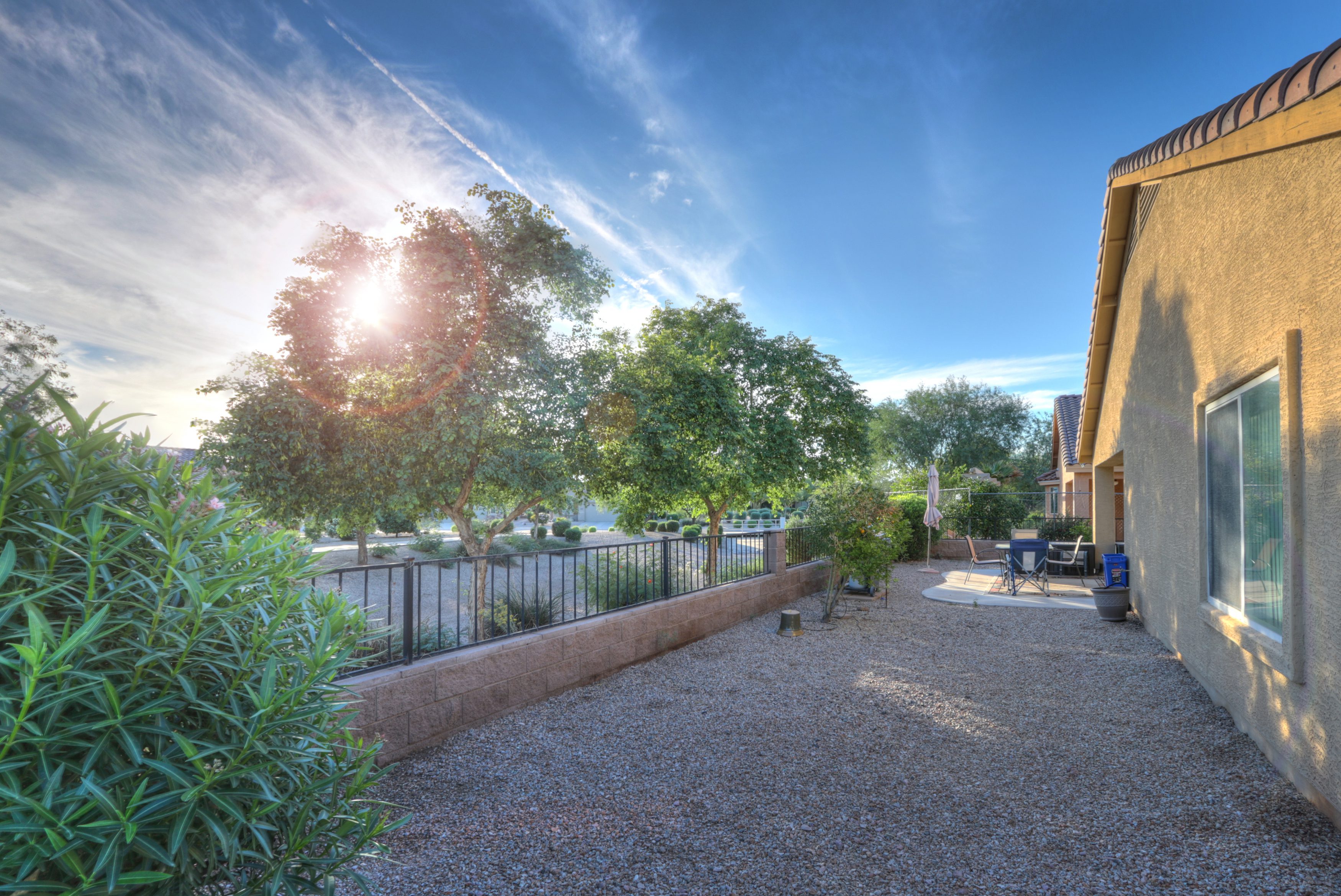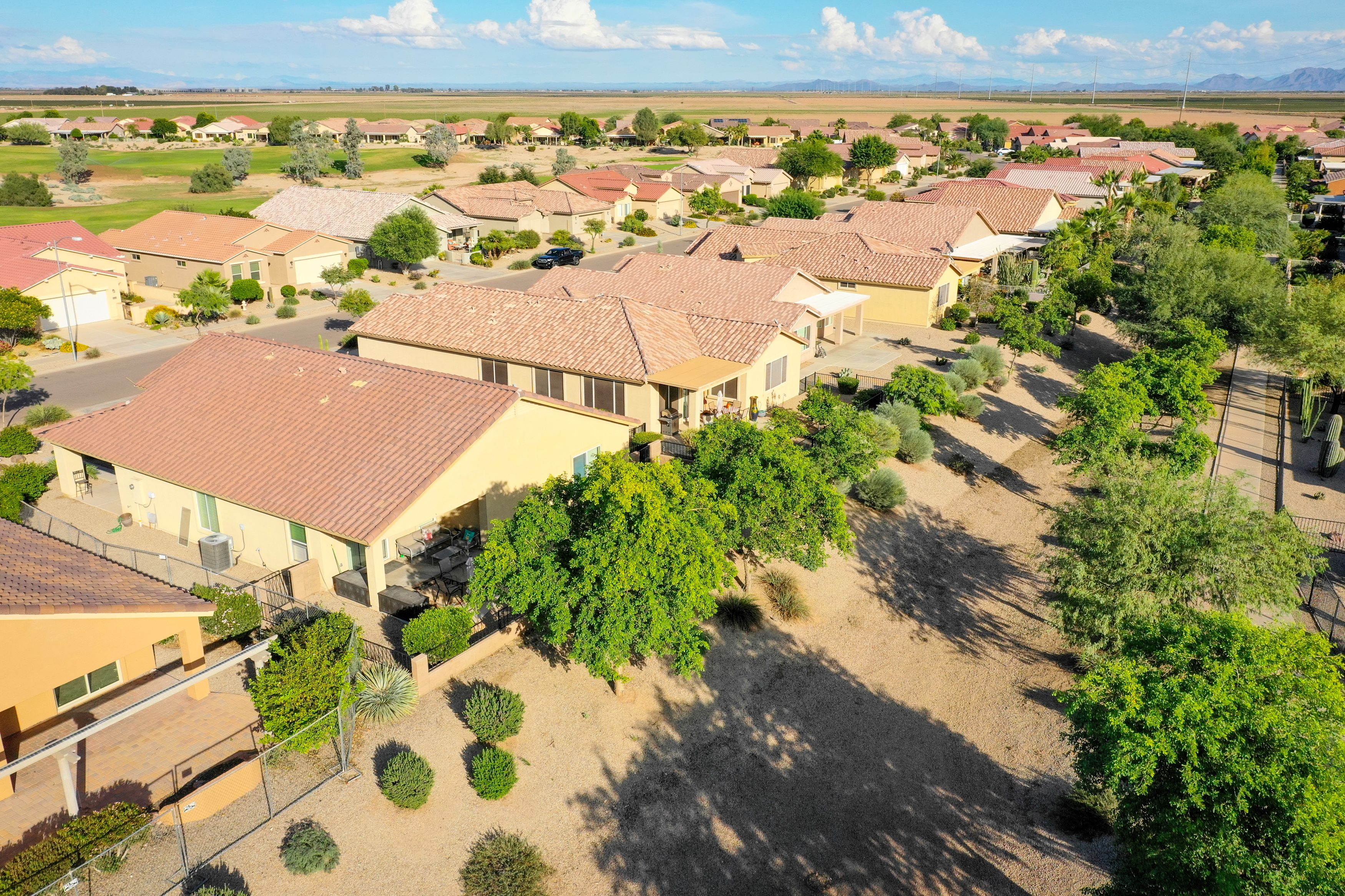 108 Model home w/South facing patio overlooking wash. This beautiful home features 3 bedrooms, 2 bathrooms, den, tile & carpet flooring, ceiling fans, large kitchen w/tons of storage, RO, granite counter-tops, eat in kitchen, french doors leading to master bedroom, extended garage, utility sink, water softener, and easy care landscaping. This home is located in the popular Mission Royale Active Adult Golf Course Community. Please call today to schedule your private showing.